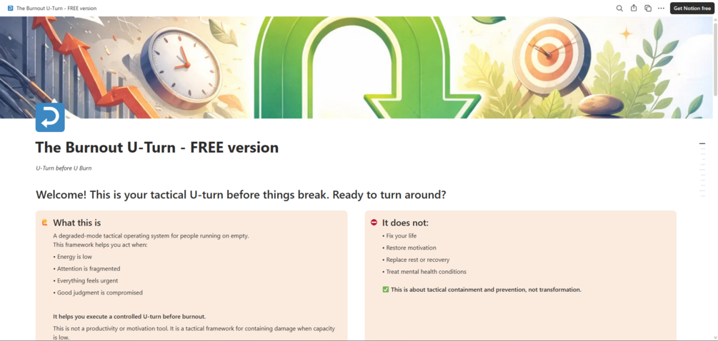 A tactical degraded mode system for people running on empty. Diagnose your state, take the least damaging next action, and execute a controlled U turn before burnout.